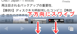 さて、使い慣れてくると先読みさせるためにタブがどんどん増えていきます。僕は読み終わった順にタブごと削除しちゃってます。このタブの削除も1アクションでできます。下のバーに表示されているタブのアイコンを下方向にスワイプ(2)するだけ。気持ちいようにサクサク削除できます。なのでページの遷移はほとんどせず、1ページ1タブで完結させ読み終わって不要になったらどんどん削除していくんです。