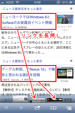 例えば、ニュースのアウトラインを読みながら、興味のあるリンクを長押し(1)してアウトラインを読み進みます。裏では新たにバックグラウンドでタブが開き詳細ページをロードしといてくれる。あなたがアウトラインを読み終わるころには、興味のあった複数の記事の詳細ページがバックグラウンドでロード完了しているはず。。。後はタブを切り替えて読むだけ。