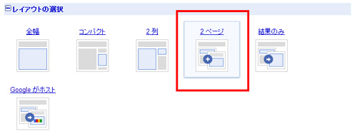 レイアウトの選択で、「2ページ」を選択します。これは、検索バーと検索結果を別ページに設置するときにつかうレイアウト。