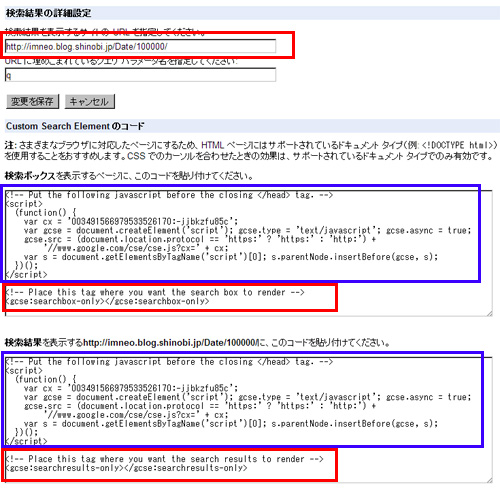 あとは、Custom Search Element のコードに記載されいるコードを忍者ブログに貼っていく事にしましょう。
