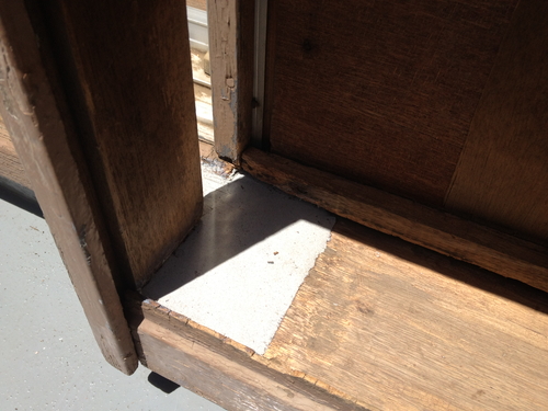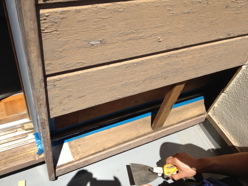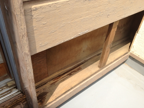 まずは、状況確認のため雨戸袋の板を下から2枚ほどはがしてみる。