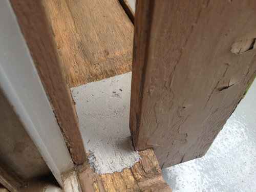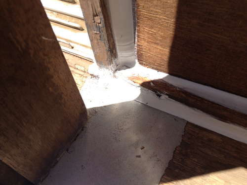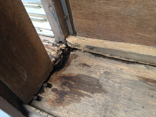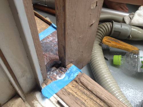 するとサッシとの接合部分の木が腐ってぼっこりと穴が空いていた。