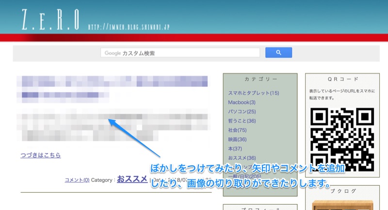 例えば、画像に矢印や文字をいれたり、切り取りをしたりなど簡単な画像編集機能がついている。ほんとに簡易編集なのでプレゼン資料やデザインなど凝った編集をするには別のツールで加工が必要になると思ったほうがいい。個人的に重宝しているのは、ぼかし機能。どうしても画面に個人情報入が写り込んでしまうような場合に手早くマスキングするのにとても便利。