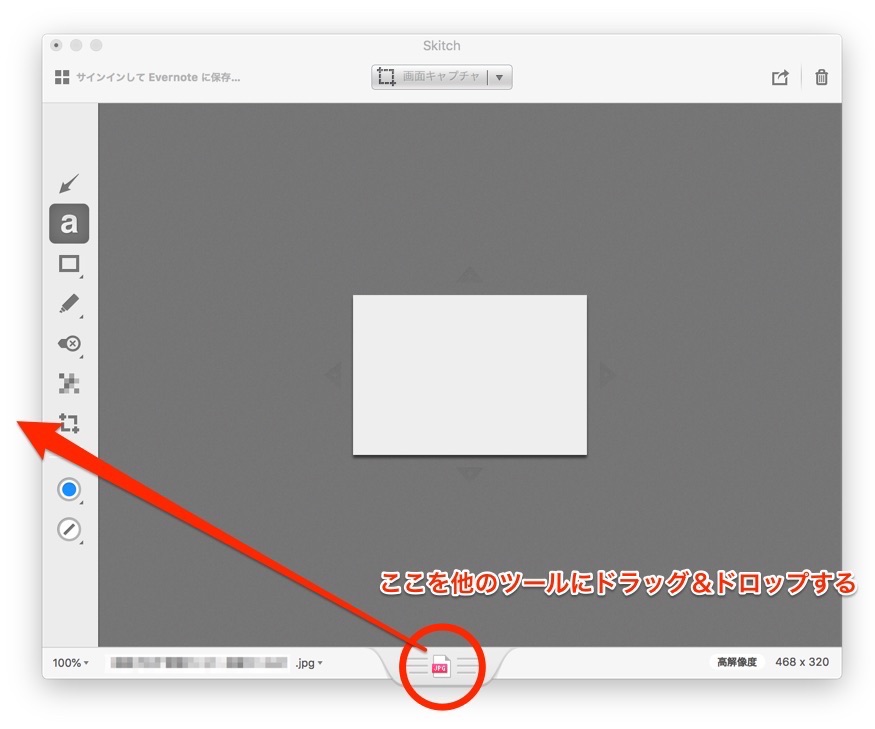 Skitchの場合、下記の画面の赤丸の部分がファイルとして扱えるようになっているので、これをこのままアップロード画面にドラッグしたり、保存したいフォルダにドラッグしたり、することができちゃいます!